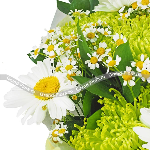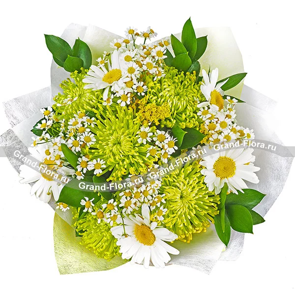 ДЕЛЮКС: хризантема одноголовая зеленая - 15 шт, танацетум - 12 шт, ромашка белая - 15 шт, рускус, фетр зеленый и белый.